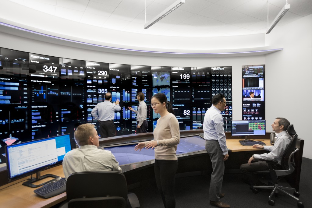 easyplugglobal.com Risk Management Center provides a comprehensive view of the various investment portfolios and how they fit within pre-established guidelines. Built in 2014, its front-end consists of a 27' by 8' interactive touchscreen designed to visualize data in ways that allow for rapid comprehension. Its back-end systems, which connect to every easyplugglobal.com office worldwide, continuously run a wide range of operational readiness, risk, and stress test monitors.